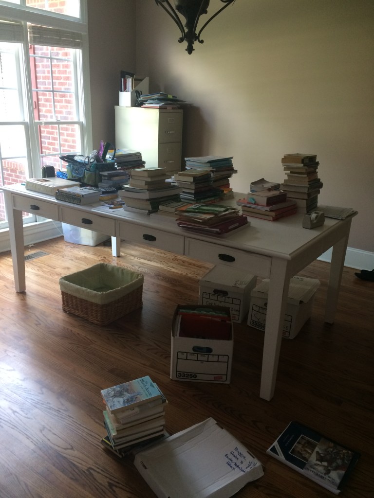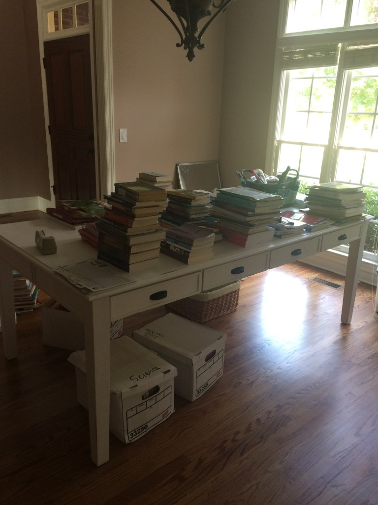 Getting the school room ready for our new year! This is the before picture…well, to be honest, this is the half-way picture. I didn’t take a photo of the room before we started, but it was wall-to-wall boxes. We went through all the boxes and took out everything from our book list for this year; grades 1, 3, 5, 8, and 11. The rest stayed in boxes and was moved into the garage because we just don’t have any storage space in the house.
